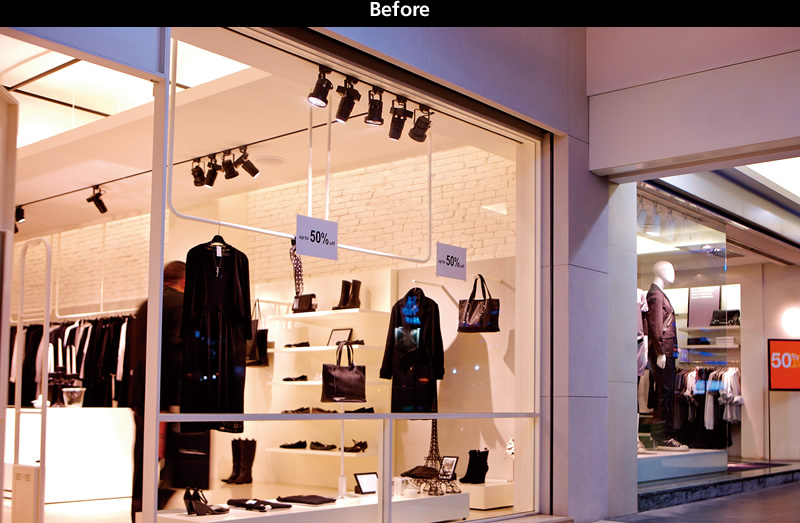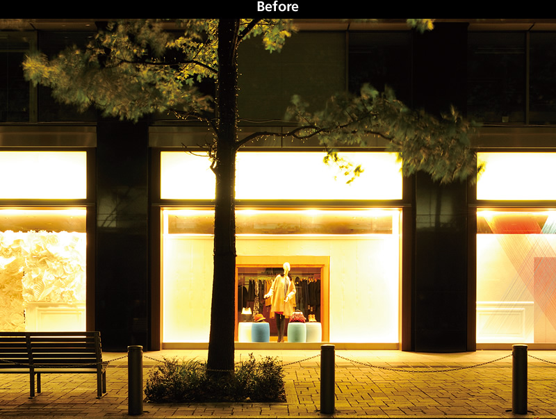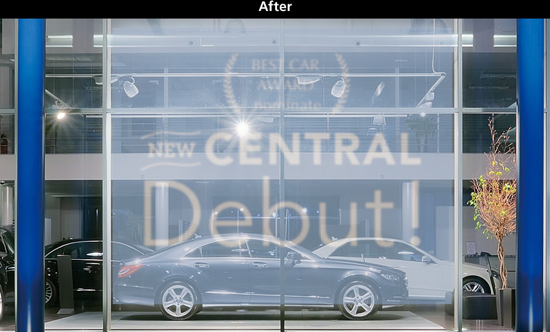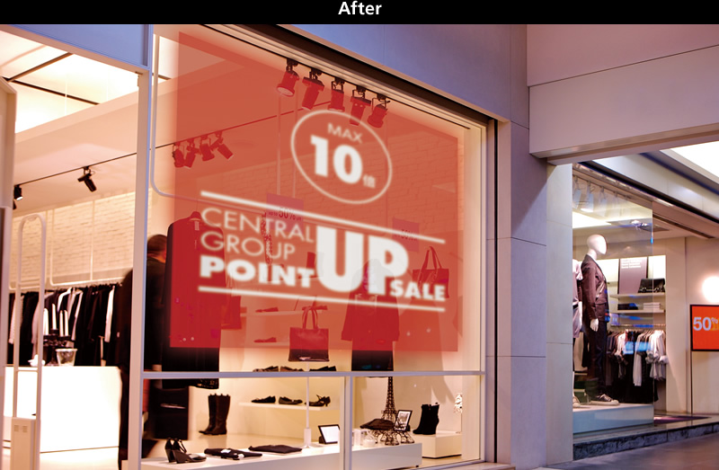 窓ガラスをそのままスクリーンとして使用できますので、従来のようにガラス越しに液晶ディスプレイを設置したり、ガラス面にポスターやカッティングシートを貼る必要もありません。