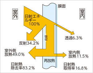 板ガラスに入射した日射エネルギーは、板ガラスによって反射、吸収、透過に分かれます。このなかで板ガラスに吸収されたエネルギーは、熱となって室内側、室外側へと再び放熱されます。室内に流入する熱量は、透過エネルギーと室内側への再放熱との合計となり、この数値が小さいほど冷房負荷が軽減されます。