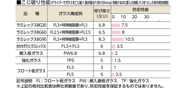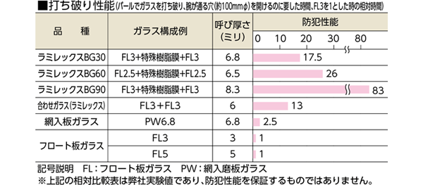 ラミレックスBGは、板硝子協会が定める防犯性能基準に合致した商品であり、官民合同会議で公表された「防犯性能の高い建物部品目録(ガラス)」に登録されている商品です。