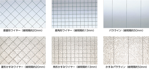 菱形ワイヤー、角形ワイヤー、パララインは、ガラスの中に金網または金属線を挿入した飛散防止性にすぐれたガラスです。